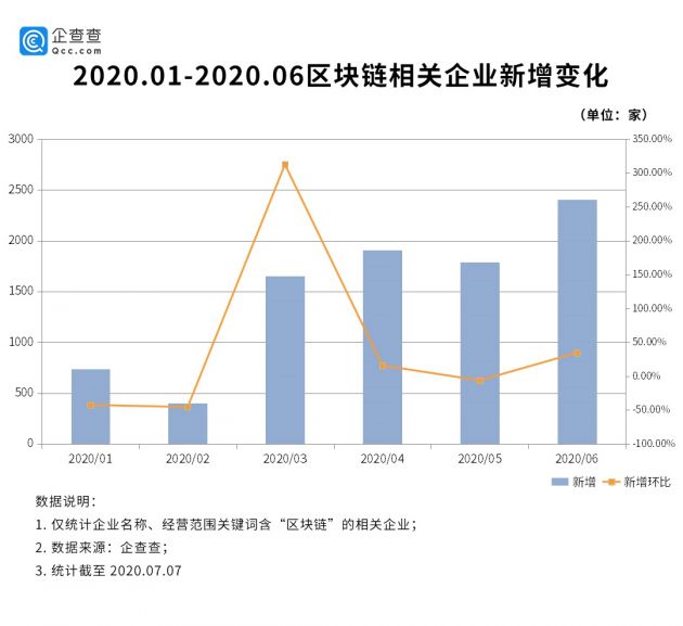 近半年来,虽然受疫情影响出现企业新增注册量短暂停滞,但待3月份疫情稍有缓和后,相关企业的注册量又迅速回升,并超过疫前水准。4月份注册量已超过1900家,远高于疫情前的2019年月均数据。在6月份,区块链相关企业新增再创新高,共新增企业2406家,环比增长34.49%。